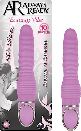 Always Ready Ecstasy Vibe Purple 10 functions, 100% Silicone. Made using phthalate free, RoHS compliant materials shaft Silicone, base ABS plastic. Insertable length 5.75 inches, overall length 7.25 inches, shaft diameter 1.5 inches, circumference 5 inches. Vibrating sex toy requires 2 AAA batteries, not included.