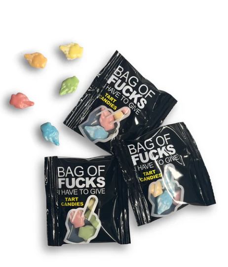 Introducing the Bag of Fucks I Have to Give candy because sometimes you just need a little humor to sweeten your day! Each bag contains 25 mini-packs containing 5 fruit-flavored middle fingers that are here to make a statement. Perfect for when you want to express how much you care—without saying a word. Whether treating yourself or gifting it to a friend who could use a laugh, this candy will surely be a conversation starter. Grab your Bag of Fucks I Have to Give today and savor the taste of not giving a damn!