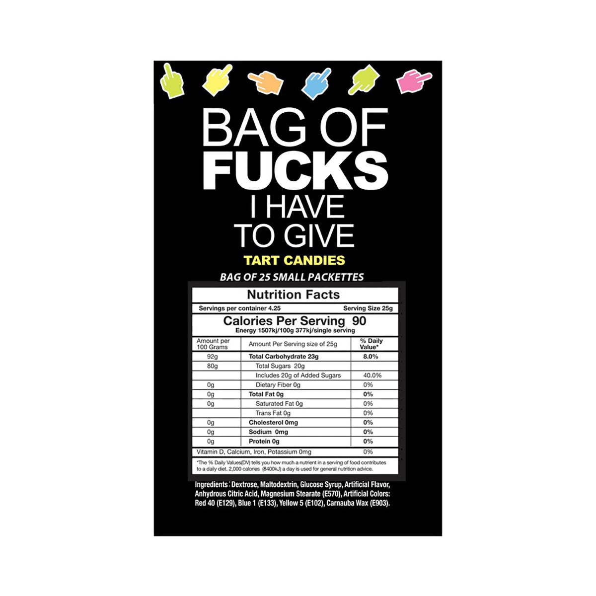 Introducing the Bag of Fucks I Have to Give candy because sometimes you just need a little humor to sweeten your day! Each bag contains 25 mini-packs containing 5 fruit-flavored middle fingers that are here to make a statement. Perfect for when you want to express how much you care without saying a word. Whether treating yourself or gifting it to a friend who could use a laugh, this candy will surely be a conversation starter. Grab your Bag of Fucks I Have to Give today and savor the taste of not giving a damn!