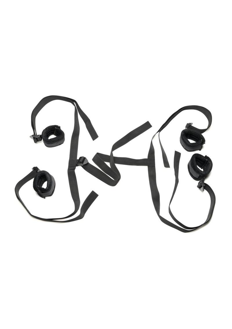 Get in bed and keep your partner there with this deluxe bed restraint system! The included wrist and ankle cuffs feature plush padding and ultra-soft fabric to keep your captive lover comfortable while you play. Easily slip the adjustable-length straps under the mattress and quickly turn any bedroom into a sex & BDSM playground. The restraints can just as easily be tucked away or removed for storage & travel so no one needs to know your naughty secret!