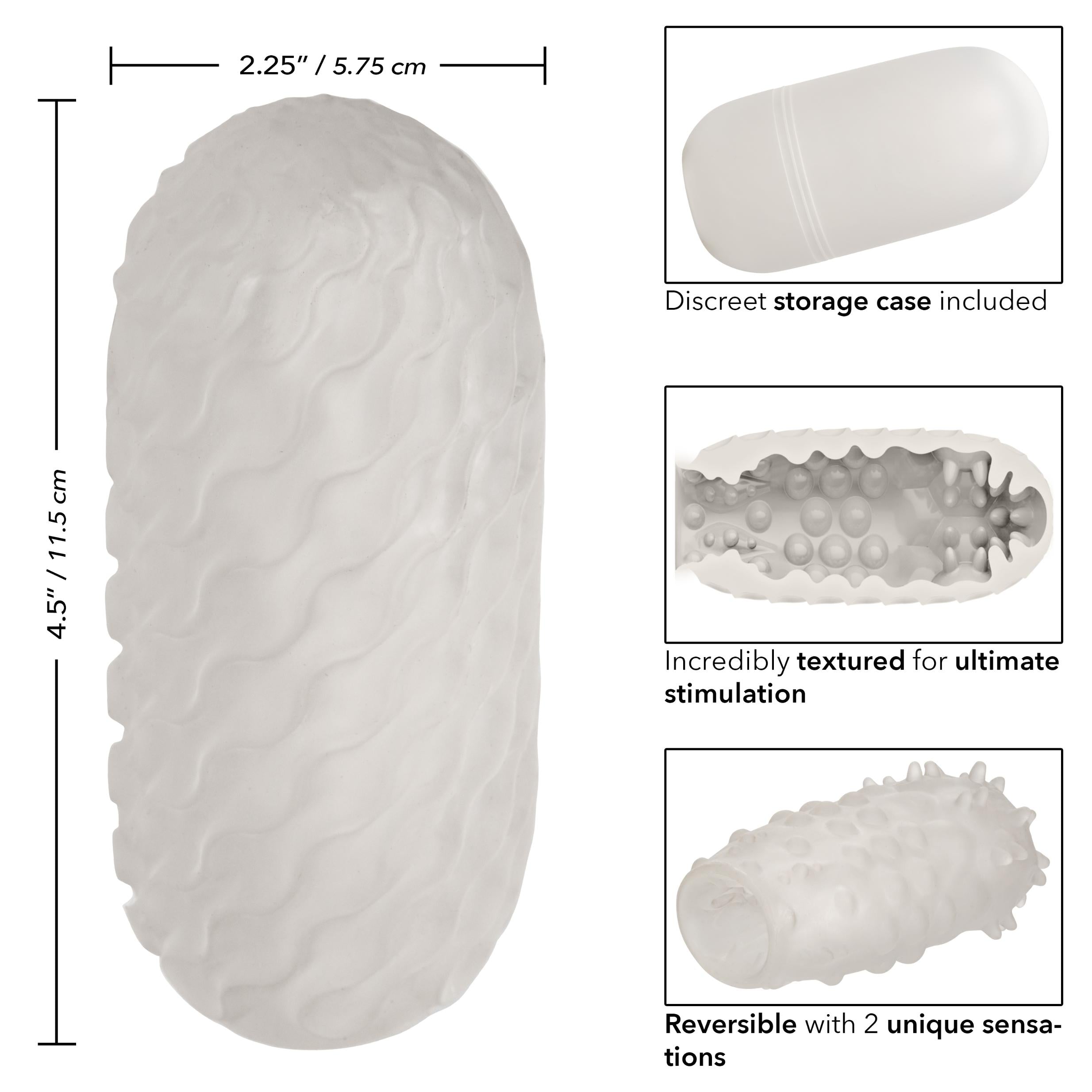 Endless pleasure is in your hands with the unbelievable Boundless Reversible Nubby Stroker. The premium stroker indulges your pleasure with reversible textured stimulation, closed-end design, and convenient storage case. Tease and please with the unique reversible design, including a soft rippling surface and teasing nubbed pattern for unique stroking sensations. Look forward to an explosive pleasure experience while the closed-end design offers superior suction. Whether indulging at home or wherever pleasure takes you, the compact 4.5" (11.5 cm) design and convenient case makes this the teasing travel companion you're craving. The premium TPR is unscented, phthalate free and maintenance free to keep your most sensitive spots, happy and healthy.