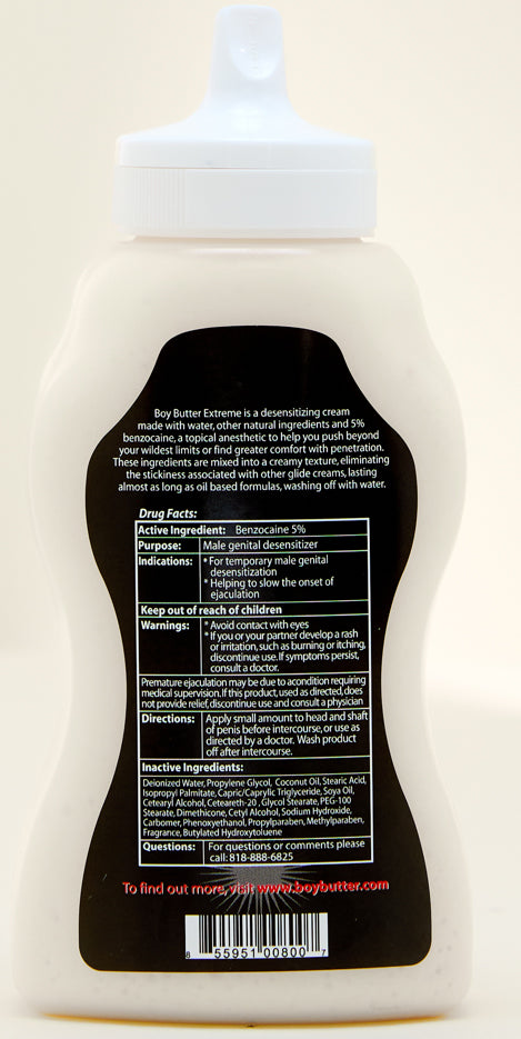 Boy Butter Extreme is a desensitizing oil-based lubricant made with 5% Benzocaine, a local anesthetic. These Ingredients are homogenized like like real butter and the end result is a personal lubricant that will numb the fun parts and last as long as any synthetic or silicone lubricant. Mixed into a creamy texture, eliminating the stickiness associated with other lubricants, as long lasting as silicone lubricants yet washes off with water alone. Better yet, it washes off with water alone, from both skin and fabric.