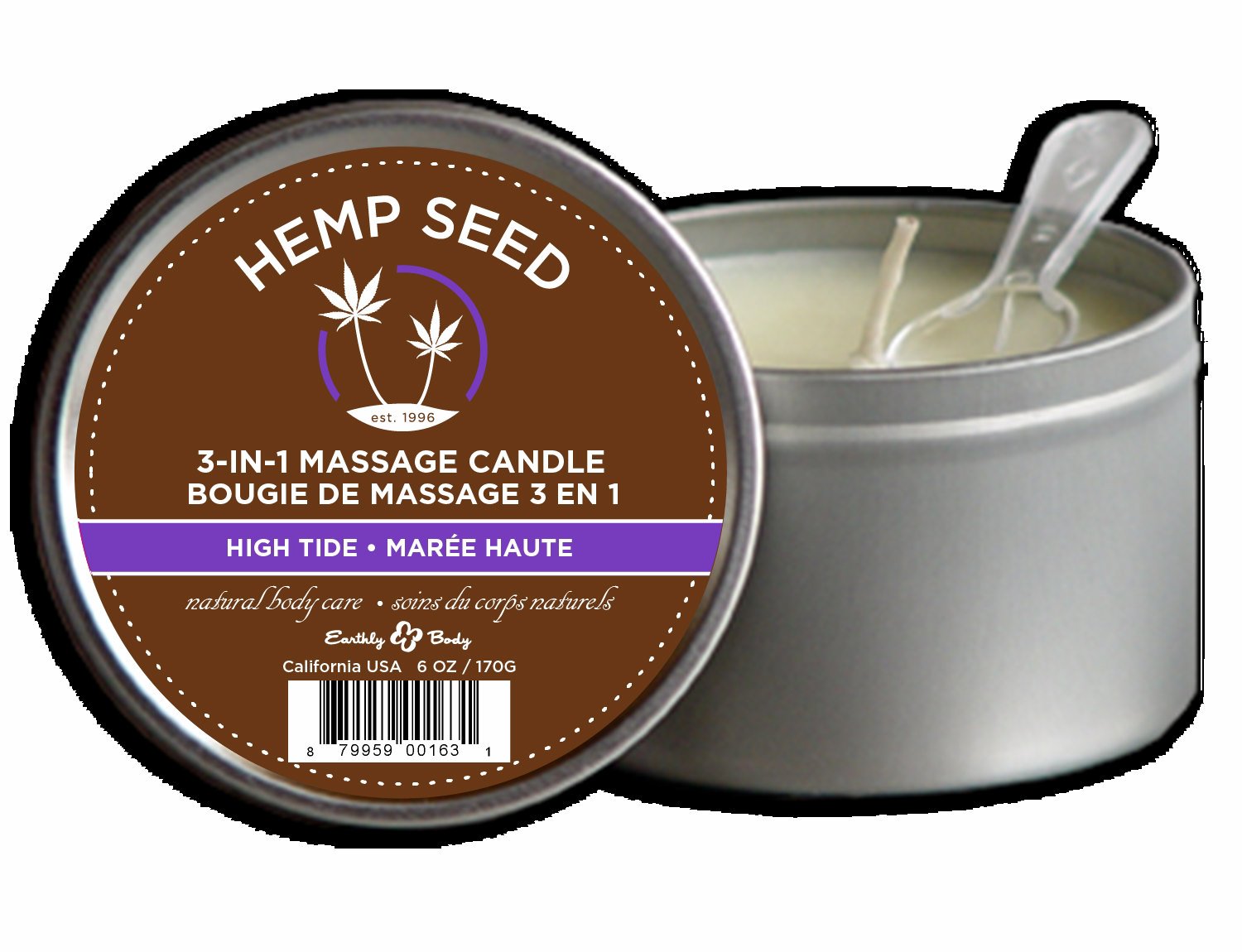 Earthly Body 3-in-1 Massage Oil Candle High Tide comes in a non-graphic round tin containers hand poured, fragrant natural soy-oil massage candle burns longer and cleaner. Candle melts into a warming, silky massage oil. Penetrates and moisturizes skin. Eight natural oils including hemp seed, Vitamin E, Jojoba, Avocado, and Apricot leave skin soft and smooth. Use right out of the shower or bath. Earthly Body's most popular skincare products are our 3-in-1 Massage Candles. They're unique, fun gifts and bonafide skin care rolled into one. These scented soy candles are all natural great-smelling, no-paraffin, no-petroleum, and clean-burning. What makes them different and fun is that they can be used for giving warm massages or can be used every day after a bath or shower as a body and skin moisturizer. Their massage candles are formulated with quality cosmetic grade ingredients. 100% vegan, non-toxic materials. All natural skin care products, hemp seed oil, lotions, hemp skin care products, soy scented candles. Never leave a burning candle unattended. Always store out of reach of small children. High Tide Round Candle. High Tide: Coconut, Lime Verbena Scent by Earthly Body of Chatsworth, California. Package dimension: Height 1.75 inches, Length 2.50 inches, Width 2.50 inches. Packaged weight 8 ounces. Categories: Erotic Body Lotions, Health and Beauty Aids, Massage Lotions, Creams, Oils. Earthly Body - Massage Candle, High Tide 6oz. Restricted, Amazon Restricted. 2023.