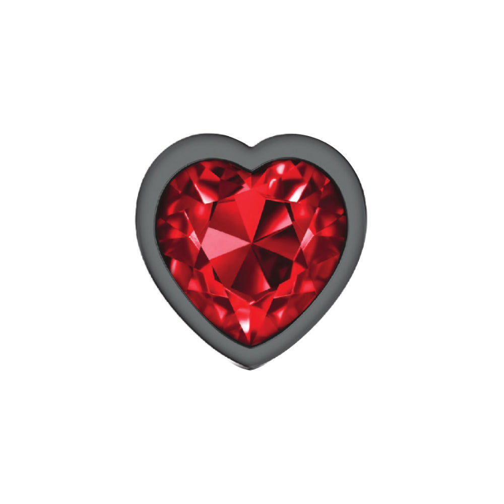 Large, gunmetal, teardrop shaped anal plug with sparkling deep red colored, heart shaped acrylic gemstone. Hypoallergenic, nonporous, body safe, nickel free, aluminum alloy, anal jewelry compatible with all lubricants. Easy to clean and dishwasher safe butt plugs.