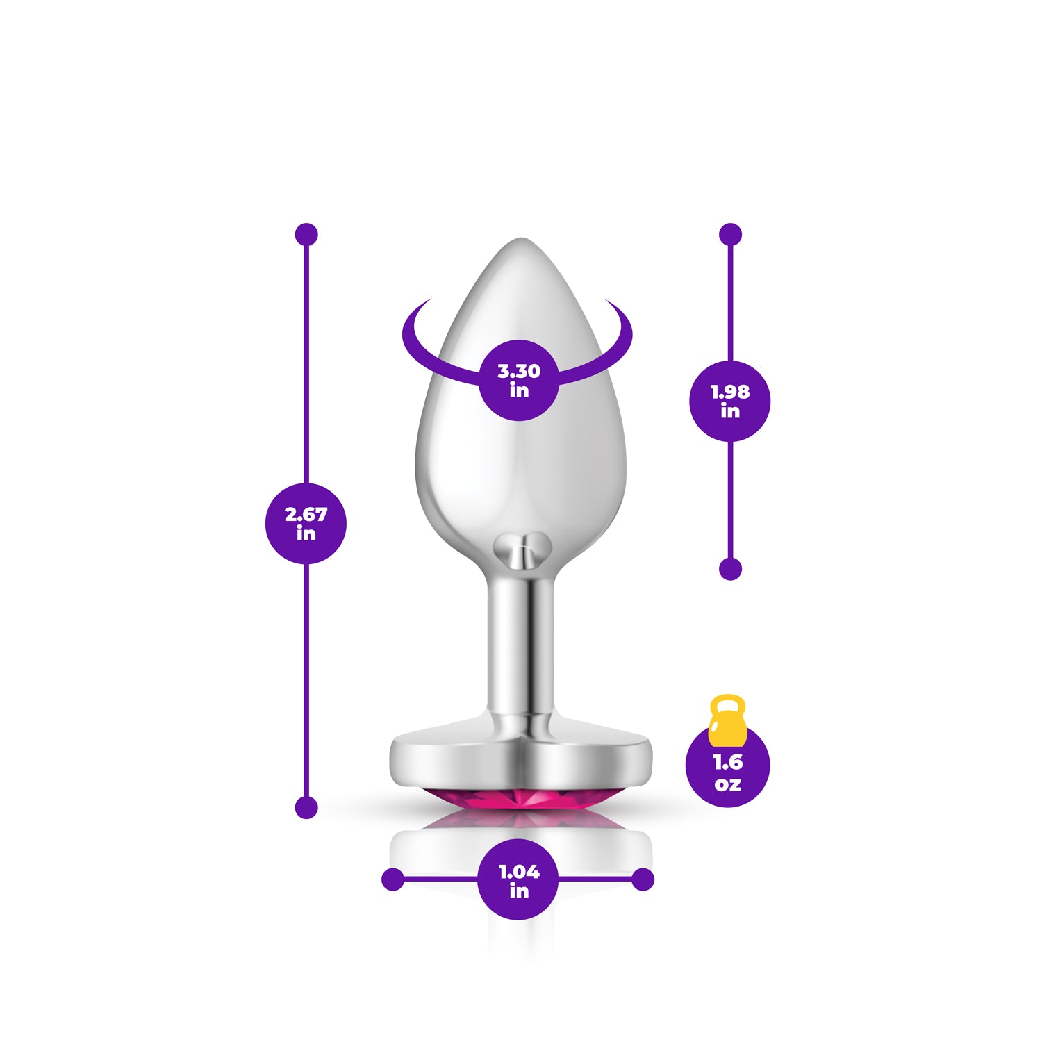 Small, silver metal, teardrop shaped anal plug with sparkling bright pink colored, heart shaped acrylic gemstone. Hypoallergenic, nonporous, body safe, nickel free, aluminum alloy, anal jewelry compatible with all lubricants. Easy to clean and dishwasher safe butt plugs.