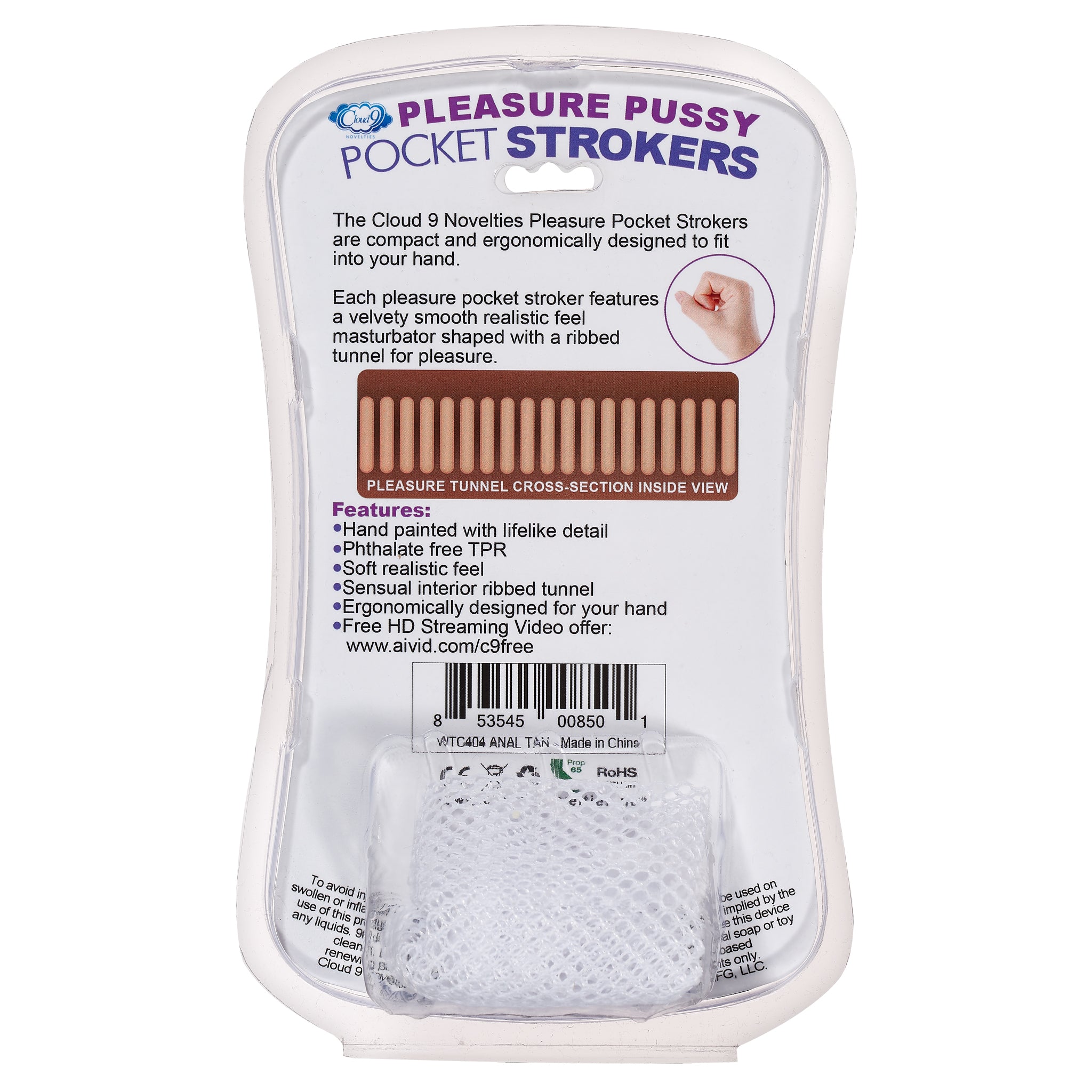 Cloud 9 Personal Anal Pocket Stroker with bonus drying pouch. Color Tan. The Cloud 9 Novelties Pleasure Anal Pocket Stroker is compact and ergonomically designed to fit into your hand. Each pleasure pocket stroker features a velvety smooth realistic feel masturbator with a ribbed tunnel for your pleasure.