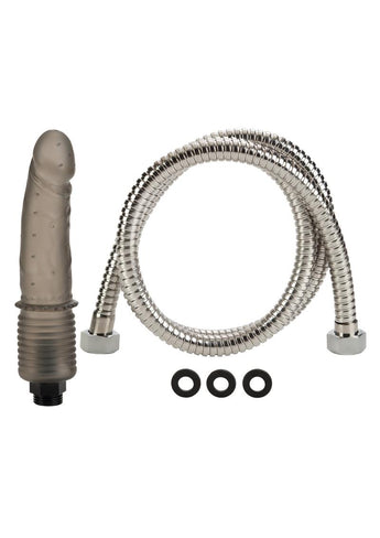 6 1/2" removable perforated soft jelly dong comes with a non-tarnishing, nickel-free hose that easily attaches to any shower.