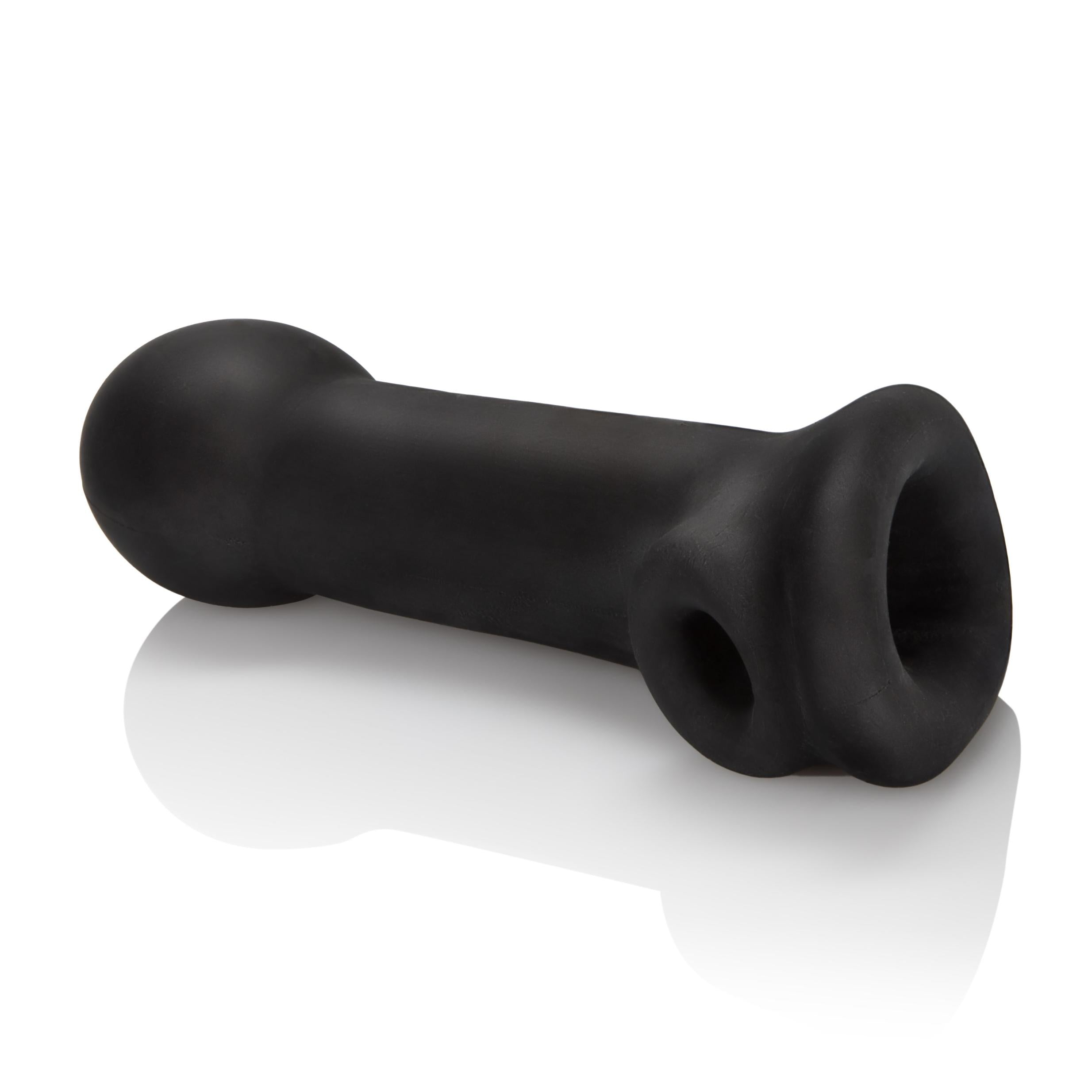 Soft and stretchy extension sleeve with built in scrotum support strap. Plushy soft PureSkin® material feels like the real thing. Textured inner chamber for added stimulation. Stretches to fit the biggest man.