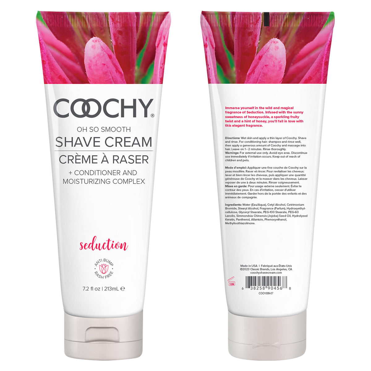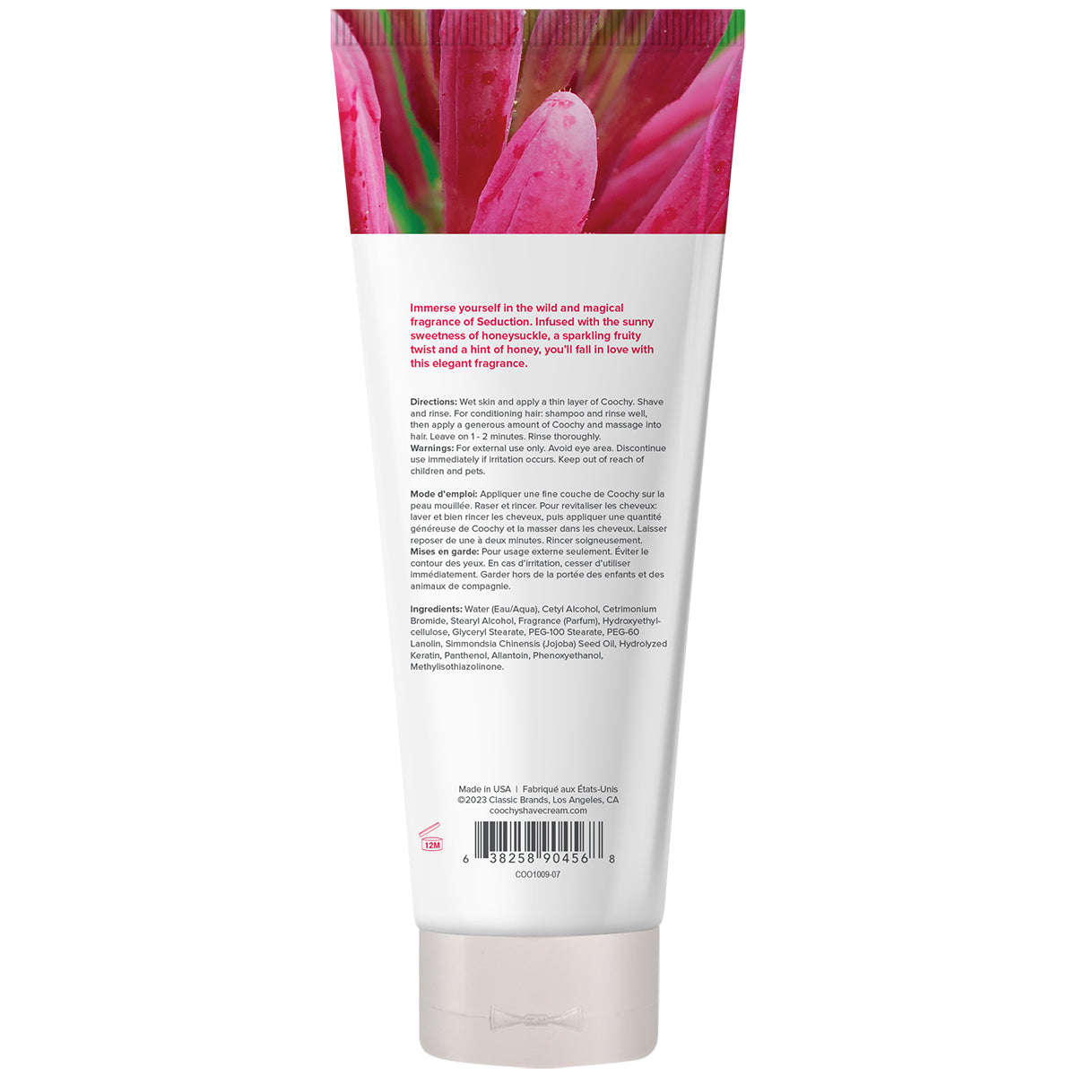Immerse yourself in the wild and magical fragrance of Seduction. Infused with the sunny sweetness of honeysuckle, a sparkling fruity twist and a hint of honey, you'll fall in love with this elegant fragrance. Our signature shave cream stops red bumps from appearing on your bikini area, underarms, legs, and anywhere else you shave. Leaves skin oh so smooth and irresistible to touch!