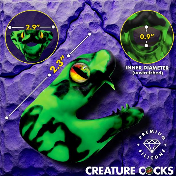 Features: Fantasy C-Ring: This fanged cobra has its mouth around your shaft! Enjoy playing with the fantasy of turning your rod into a fearsome cobra snake! Depth Control: The cobra ring extends about 2 inches. This provides a buffer for depth control and something to bump and grind against. Extended Play: The tightness around the shaft increases the firmness of your rod and extends your play. Body-Safe: Made out of body-safe silicone and has phthalate-free, plastic eyes. Measurements: Overall: 2.3 inches Length x 2.9 inches Width Inner diameter (unstretched): 0.9 inches (22mm) Materials: Silicone, plastic Color: Green, black Note: Use with water-based lubricants for best results.
