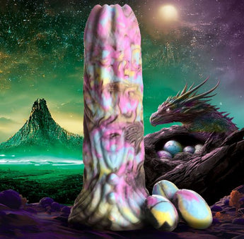 Be the brooding mate of this dragon with this Dragon Spawn Ovipositor dong! The pastel blue, yellow, pink and black rod has a unique texture of whorls, ridges, grooves and spikes that will send you to another world of pleasure! The hollow center is wide enough for the 3 silicone eggs to slip through and impregnate you with! The wide, flanged base makes it harness-compatible. Made out of premium, phthalate-free silicone, it has a firm core and soft, silky surface. Explore every sci-fi, fantasy, roleplay or cosplay scene you want with this epic adult toy! Use only with water-based lubricants for best results. After play is over, wash the dildo with warm water and soap and use a toy cleaner to spray clean. Wipe dry and store in a cool, dark place out of direct sunlight. On Alpha X, the dimension where dragons reign, you lean back against the cave wall, chained at the ankles and wrists, waiting in a line of people to be presented to the brooding dragon King. A decade ago, your worlds converged and revealed there are several layers of realities. As part of the peace treaty to connect the worlds, your world and many others agreed to help solve the problems across the universes… and that left those without a voice subject to the whims of those in power. Alpha X has had a problem with breeding their mates, and once humans and dragons began experimenting behind closed doors, they discovered certain humans make perfect breeding mates for the royal line of dragons that have been somewhat infertile in the last century. "Move forward! You! You're next!" a goblin looking man yells at you to get up and present yourself to the dragon royalty. You step up, shaking but refusing to show your fear, and take your first good look at this dragon. Its eyes are wide, slitted, and golden. Its body is soft pastel with whorls of grooves and ridges, colors that help it camouflage into the strange, alien terrain. It shakes its body as if a shiver ran down its spine, licks its lips. You lock eyes with it and feel the heat rising to your cheeks. Its gaze becomes unbearably intense and you look away. You feel ashamed for losing your nerve, but then the goblin grabs you by the arms and says, "Move! Quickly now! It's chosen you!" You're rushed to the baths to clean up, and then unshackled and thrown into a chamber full of gold and dimly lit torches. At first, you hear a shuffling, shifting sound of a creature scraping its scales against the floor. The dragon is making its way down the hallway to its horde. Then you hear the grumbling, rumbling sound of its growl, deep in its belly where all the fire and flame is kept. Then it comes to you. As it gets near, you see the throbbing shaft between its thighs, so huge that it makes you begin to fear for your life for the first time. You start to back away, trying to look for an exit and see no escape. The dragon steps over you and pins you down. Its long tongue tastes the air around you and you feel the rough tongue against your bare skin. It lets a heavy, fat drop of sizzling hot drool drop between your thighs. You feel a flash of pain and then warm, fuzzy ecstasy spread across your body. You relax, surrender, forget why you're there. Then you quickly remember when its rod shoves itself inside you. You cry out, the pain is so intense and your hole is stretching so quickly! The dragon heaves, moves inside of you, groans, and then you feel yourself stretching even further! Within you are eggs, deeply implanted inside of your womb, the heat of them causing you to sweat! The dragon gets off of you and you pass out. Measurements: Overall length: 7.3 inches. Insertable length: 6 inches. Narrowest insertable diameter: 1.8 inches. Widest insertable diameter: 2.3 inches. Eggs are 1.5 inches x 1 inches. Materials: Silicone Color: Pink, yellow, blue, black Note: Use only with water-based lubricants for best results.