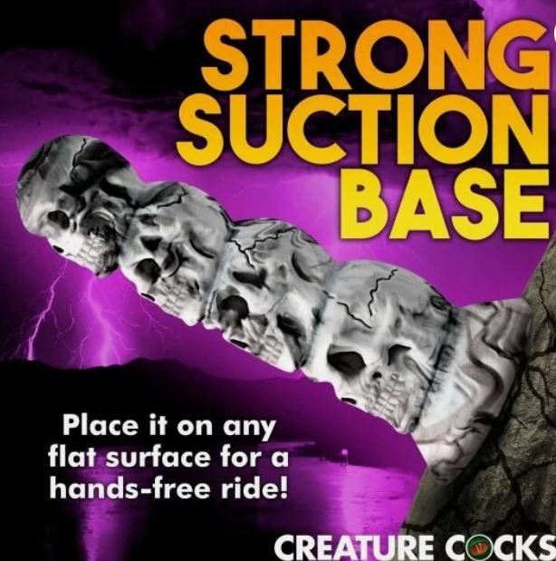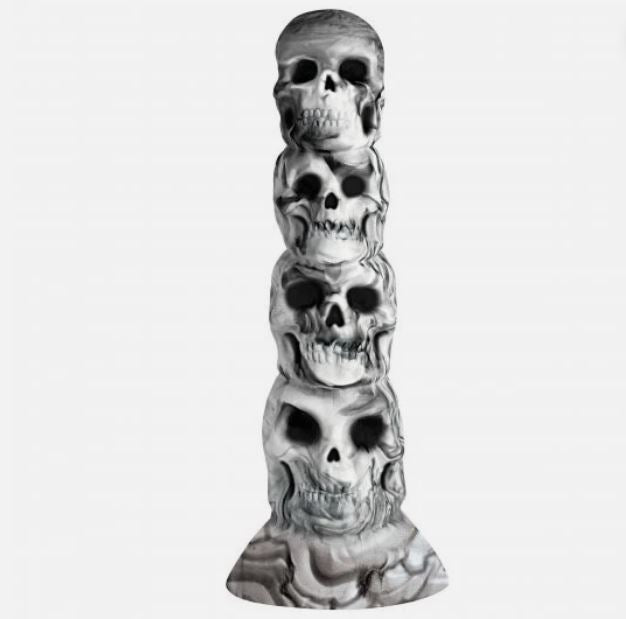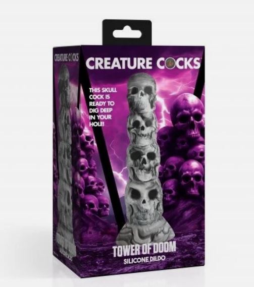 Absorb the dark magic of pleasure with this Tower of Doom dildo! This tower of skulls stacked upon each other has countless unique grooves and ridges, and the thick shaft is designed to stretch your dark holes! Made out of premium, silky smooth, phthalate-free silicone it has a squishy outside and firm, flexible core that is body-safe. Only use water-based lubricants for best results. The strong, suction-cup base lets you ride hands-free when it's placed on any flat surface. It's harness-compatible so you can enjoy it with a partner or attach the harness to a chair or bench. Enjoy your kinky cosplay, fantasy roleplay, and self-pleasure with this fantasy dildo! After play, wash with warm water and mild soap then spray with a toy cleaner and let it air dry.