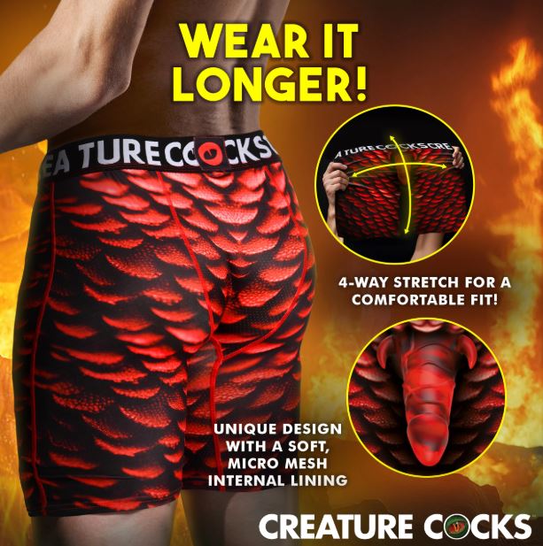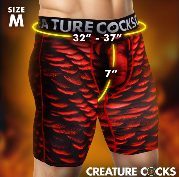 Features: Creature Underwear: Upgrade your underwear with vibrant colors and fantasy themes! This pair of Horny Devil Underwear is covered in red scales with deep shadows. A demonic dong is centered on the crotch, enhancing your bulge. Breathable Boxers: Enjoy some airflow! These boxers have a breathable, mesh pouch in the crotch. Stretchy: The polyester and elastane blend ensures plenty of stretch so you can stay mobile and bust out all your best moves! Soft Waistband: The waistband is made out of microfiber so you can enjoy comfortable boxers that stay in place and don't slide down. Measurements: Fits 32 inches - 34 inches waist circumference Inseam: 7 inches Materials: 89% polyester, 11% elastane Color: Red, black Note: Wash in cold water to preserve the color and elastic.