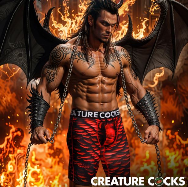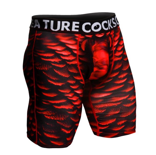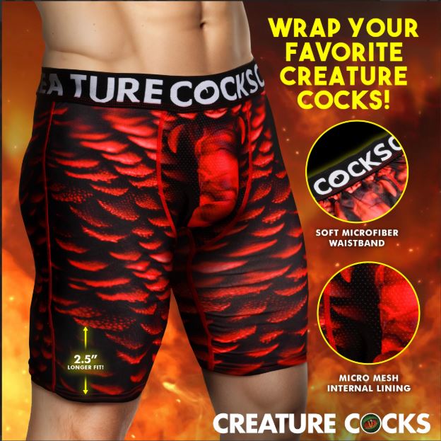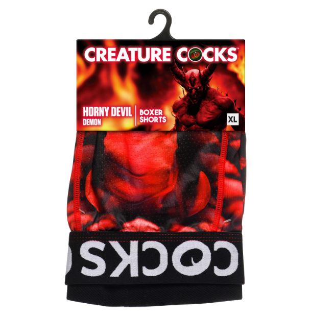 Features: Creature Underwear: Upgrade your underwear with vibrant colors and fantasy themes! This pair of Horny Devil Underwear is covered in red scales with deep shadows. A demonic dong is centered on the crotch, enhancing your bulge. Breathable Boxers: Enjoy some airflow! These boxers have a breathable, mesh pouch in the crotch. Stretchy: The polyester and elastane blend ensures plenty of stretch so you can stay mobile and bust out all your best moves! Soft Waistband: The waistband is made out of microfiber so you can enjoy comfortable boxers that stay in place and don't slide down. Measurements: Fits 40 inches - 42 inches waist circumference Inseam: 7 inches Materials: 89% polyester, 11% elastane Color: Red, black Note: Wash in cold water to preserve the color and elastic.