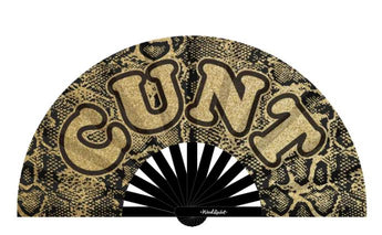 Cool yourself in style with this “Cunt” large-sized folding hand fan. The glittery gold design is colorful and fun with just the right attitude! Made of glossy bamboo ribs and high-quality satin material. 13”H x 24.5”L x 0.75”W (unfolded) Glittery Gold Satin Glossy Bamboo Ribs