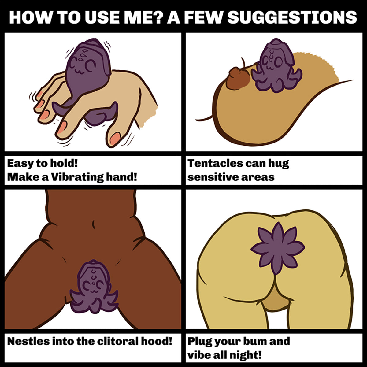 Princette Puppypus comes from a planet that is entirely covered in water, and so they love it when things are wet, whether from your body or your favorite lube. Our Princette makes a great vibrating butt plug, and is also so much more. They make a great stand-alone vibrator with a ring of independently buzzing legs on one side and a larger curved vibrating head on the other. Both the legs and the head make this Royal We easily grasped by all hands, and can slide between fingers for an open-handed explorative grip. Princette Puppypus is a versatile and euphoric friend.
