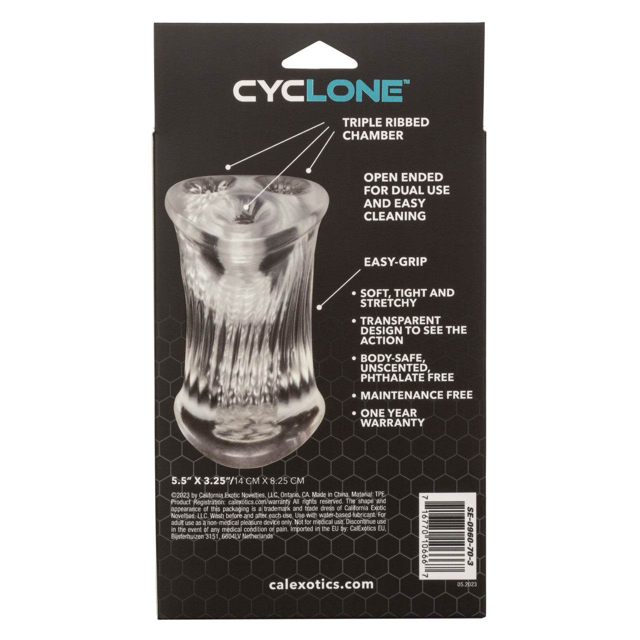 Cyclone Triple Chamber Stroker 5.5 inches Clear from California Exotic Novelties. Intensify your pleasure with the Cyclone Triple Chamber Stroker. This premium masturbator is designed to take your experience to new heights with its innovative features and exceptional design. Featuring an easy grip design, this stroker ensures a comfortable and secure hold, allowing you to fully control your pleasure. The triple ribbed chamber design provides sensational stimulation as you glide through each chamber, delivering mind blowing sensations that will leave you craving more. With its transparent design, you can immerse yourself in the visual delight of every moment, enhancing your arousal and making your experience even more exciting. The soft, tight, and stretchy material of the stroker offers a life like feel that will heighten your pleasure to new levels. The open ended design allows for dual use and easy cleaning. Indulge in the ultimate pleasure with the Cyclone Triple Chamber Stroker. Its multi-chambered design and exceptional functionality are designed to provide you with intense sensations and unforgettable experiences.