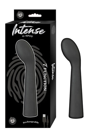 Intense G-Spot Black Vibrator from Nasstoys of New York features 7 functions. Waterproof vibrations. Phthalates free RoHS Compliant material 100% silicone. Size length 6 inches, width 1 inch, diameter 1.125 inches. Rechargeable vibrations. Charging time 120 minutes, working play time 70 minutes.