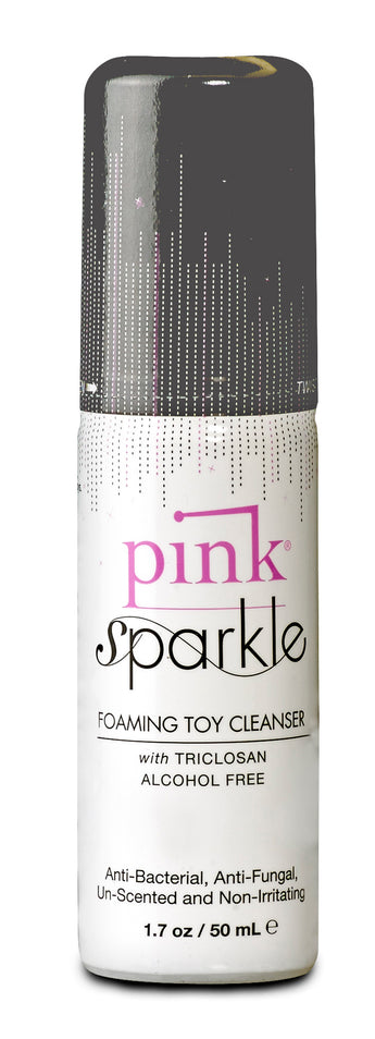 Pink Sparkle Foaming Toy Cleanser. New improved formula! Keep your bedroom toys clean to ensure your intimacy is healthy and safe. Our unique foaming formula stays where you put it and evenly coats your toy to ensure complete clean up. Safe for use on all latex, rubber, silicone and glass items, and will never dry out or damage toys. Our little bottle lasts 50% longer than spray cleaners. Easy apply foam. Scent and pigment free. Safe for all toys. Alcohol, glycerin, paraben free. Washes off with soap and water. New improved formula. Not available in Canada.Note: wipe toy with a clean cloth and always rinse toy with plain water and dry before insertion.
