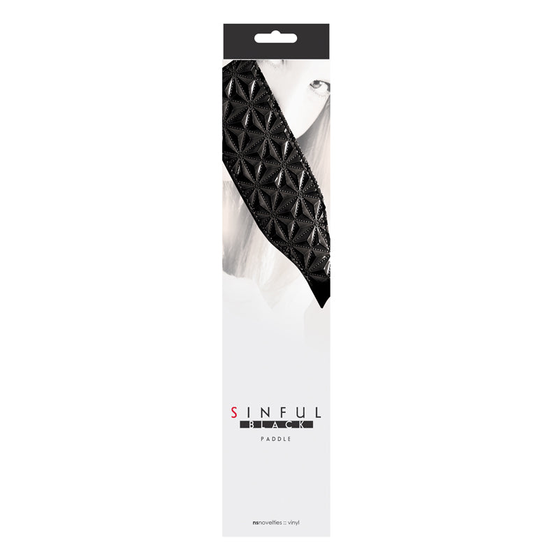 Sinful Black Paddle. Sinful has been the name in affordable playful kink. Now, Sinful just made sexy a little bit sexier! NS Novelties is excited to introduce Sinful: Black. Everyone's favorite collection is now available in a stunning midnight black finish while continuing to deliver the quality you expect. Black, nickel free anodized hardware, aesthetically striking embossed vinyl, and lined in soft yet durable liquid play friendly neoprene.