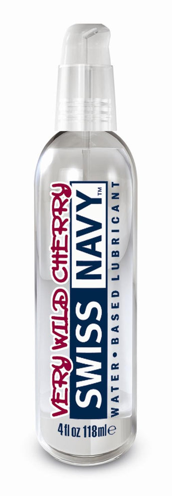 Swiss Navy Flavored Lubricants decadently delicious water based lubes in four freshpicked flavors: Very Wild Cherry, Passion Fruit, Strawberry Kiwi and Pina Colada. Each sold separately. Swiss Navy premium personal lubricants are setting the standard in today's marketplace. The finest ingredients available are blended into the three formulas: silicone, water based and water based flavors for exceptional glide and slickness.The taste! Swiss Navy Flavors taste so real they seem too good to be lubes. MD Science Labs uses a fortune 500 food company to formulate their flavors to ensure Swiss Navy Flavors would taste. genuinely like their name. All the flavors are paraben-free and sugar-free and are non-sticky. Swiss Navy premium lubes come in a patented Leak-proof, lockable pump bottle. The sleek packaging is designed to be on the nightstand, not in it. Leak-proof, lockable pump. Very travel friendly, no spills no mess, will not stain sheets. Ingredients: Water, Glycerin, Cellulose Gum, Propylene Glycol, Sodium Benzoate, Sodium Saccharin, Potassium Acesulfame, Diazolidinyl Urea, Flavor Aroma, Citric Acid, PEG-8, Disodium EDTA, Potassium Sorbate. Swiss Navy Flavor Very Wild Cherry 4 fluid ounces from MD Science Labs. Swiss Navy - Flavored Lubricant. 2022.