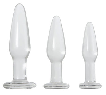 Features: 3 different sized anal plugs. Small Butt Plug size 4.55 inches by 1.15 inches, Medium Butt Plug size 5 inches by 1.35 inches, Large Butt Plug 5.75 inches by 1.5 inches. Made from durable, tempered Borosilicate glass. Non-allergic, non-porous, hygienically superior. Use with any of your favorite lubes, easy to clean. Categories: Anal Toys, Sex Toys for Couples, Men, Women, Sensual Kits, Anal Trainer Kits. 2023.