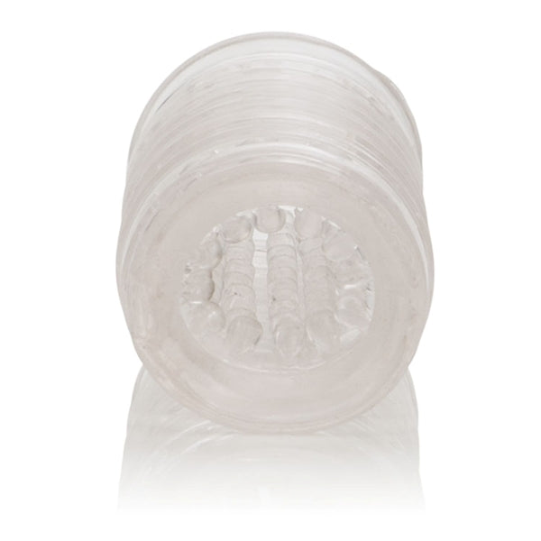 Dr. Joel Kaplan Reversible Masturbator Sleeve Clear from California Exotic Novelties. Enjoy double the fun and ecstasy with the super stretchy masturbator. The sensuous pleasure tickler covered sleeve is designed for self gratification and extended orgasmic climax. The masturbator is endorsed by world renowned Dr. Joel Kaplan and is suitable for first time and experienced users. The exotic stroker is made from soft and ultra stretchy, hygienically superior Thermmoplastic Elastomers TPE. Sleeve measures a compact 5 inches by 1.75 inches. The translucent cylindrical chamber is adorned with tantalizing teasers and is fully reversible, for intensified and mind blowing dual stimulation pleasure. The light weight, erotically textured sleeve comfortably engulfs the erect penis, and delivers intensely satisfying sliding and gliding action. To increase your personal play time fun, always use a quality water based personal lubricant with this sex toy. This masturbator is perfect for spontaneous solo intimacy, or for arousal and stimulation during red hot couple’s action. For maximized enjoyment select your preferred textured side, and enjoy unlimited teasing and pleasing as you explore your secret fantasies. Before and after every use, clean the masturbator sleeve with warm soapy water, or a toy cleaner spray. Like having two different male masturbation devices in one. One side is smooth and the other side has textured tickler ribs on the entire surface. Bulk weight 2.9 ounces.