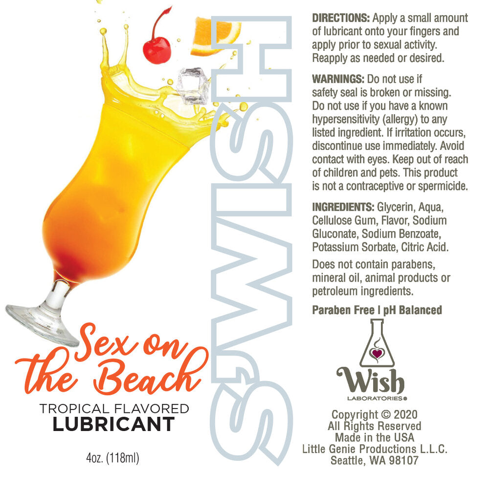 Swish Sex On The Beach 4 fluid ounces from Little Genie Products. Whether you like to play alone or with friends, Swish cocktail inspired lubes are made from top shelf ingredients. Pick your pleasure and enjoy the smooth glide of Swish lubricants. Directions: apply a small amount of lubricant on your fingers and apply before sexual activity. Reapply as needed or desired. Warnings do not use if safety is broken or missing. Do not use if known hypersensitive or allergies, to any listed ingredient. If irritation occurs discontinue use immediately. Avoid contact with eyes. Keep out of reach of children. This is not a contraceptive or spermicide. Ingredients Glycerin, Water, Cellulose Gum, Flavor, Sodium Benzoate, Potassium Sorbate, Citric Acid. Does not contain Parabens, Minerial Oil, Animal Products, or Petroleum Ingredients. Paraben free pH Balanced. Tropical Flavored Lubricant. Wish Laboraties. Little Genie Productions LLC. Made in the USA.