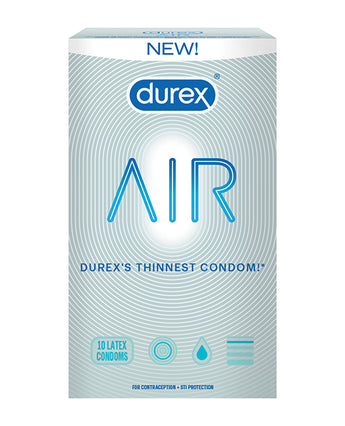 Durex Air 10 Count Latex Condoms from Paradise Products. Thin latex. Extra Thin. Air condoms are the thinnest developed by Durex while providing a high level of protection against STI's and pregnancy Transparent. Extra thin, lubricated and nearly see through, these condoms are made from premium quality, natural rubber latex. For contraception. STIs prevention. Barcode 067981087987. Categories: Condoms, Sex Toys for Couples, Health and Beauty Aids, Durex Condoms. 2024.
