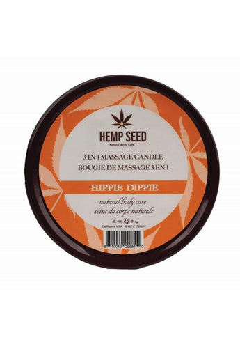 Hemp Seed 3-in-1 Massage Candle Hippie Dippie is lushly scented with toasted coconut, sparkling cashmere and sandalwood. VEGAN, THC-FREE. Specially formulated to melt a couple degrees above body temperature, our 3-in-1 massage candles donb t just provide romantic light and fragrance b they melt into a decadent blend of six natural oils that can be used as a moisturizer or for a warm massage. Hemp seed oil, the primary ingredient in these candles, has a fantastic slip factor for massage and, because it absorbs to the lipid layer of the cells, skin is left soft and moisturized, not greasy or goopy.