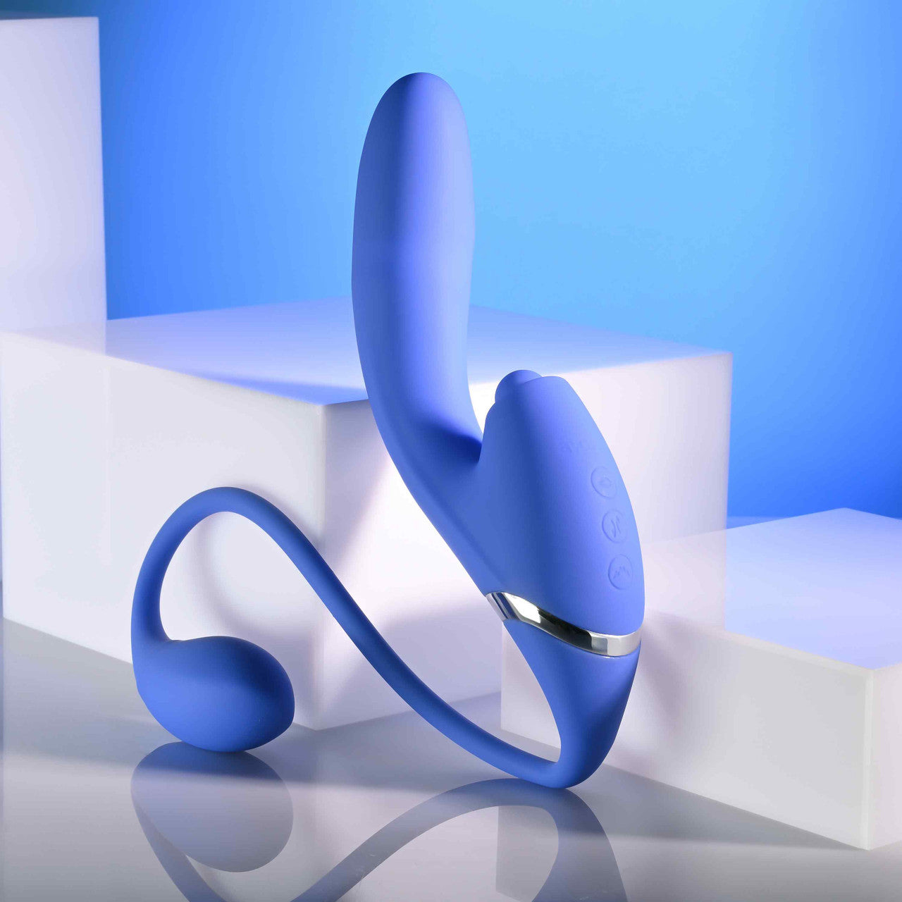 Go all in for pleasure! This unique toy features a gently curved, flexible, thrusting main shaft and a tapping stimulator that's designed to thumpity-thump in multi-speeds right where you want it most. Finally, a long flexible tail finishes with a plump, ergonomic vibrating plug to complete the rapturous experience. All 3 motors are controlled independently with their own buttons at the chunky center base that offers a relaxed grip. Specs: 7 thrusting speeds in main shaft (.25" thrust) 10 vibrating speeds & patterns in tail plug 3 tapping speeds in stimulator Insertable length 3.5", Insertable diameter 1.4" Made from phthalate & latex-free silicone & ABS USB rechargeable, cable included Height: 17.7", Depth: 5.9", Width: 1.8" Waterproof