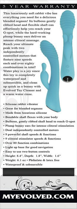 This luxuriously soft rabbit vibe has everything you need for a delicious blended orgasm! Its bulbous gently ribbed head and flexible shaft can effortlessly help you reach your G-spot, while the hard working plump bunny ears deliver an intense clitoral massage. Reach your ultimate peak with two independently controlled motors that feature nine speeds each and over eighty combinations in total! Water play is a joy since this toy is completely waterproof and submersible, and clean up quick as a bunny with Evolved Toy Cleaner and a warm water rinse.