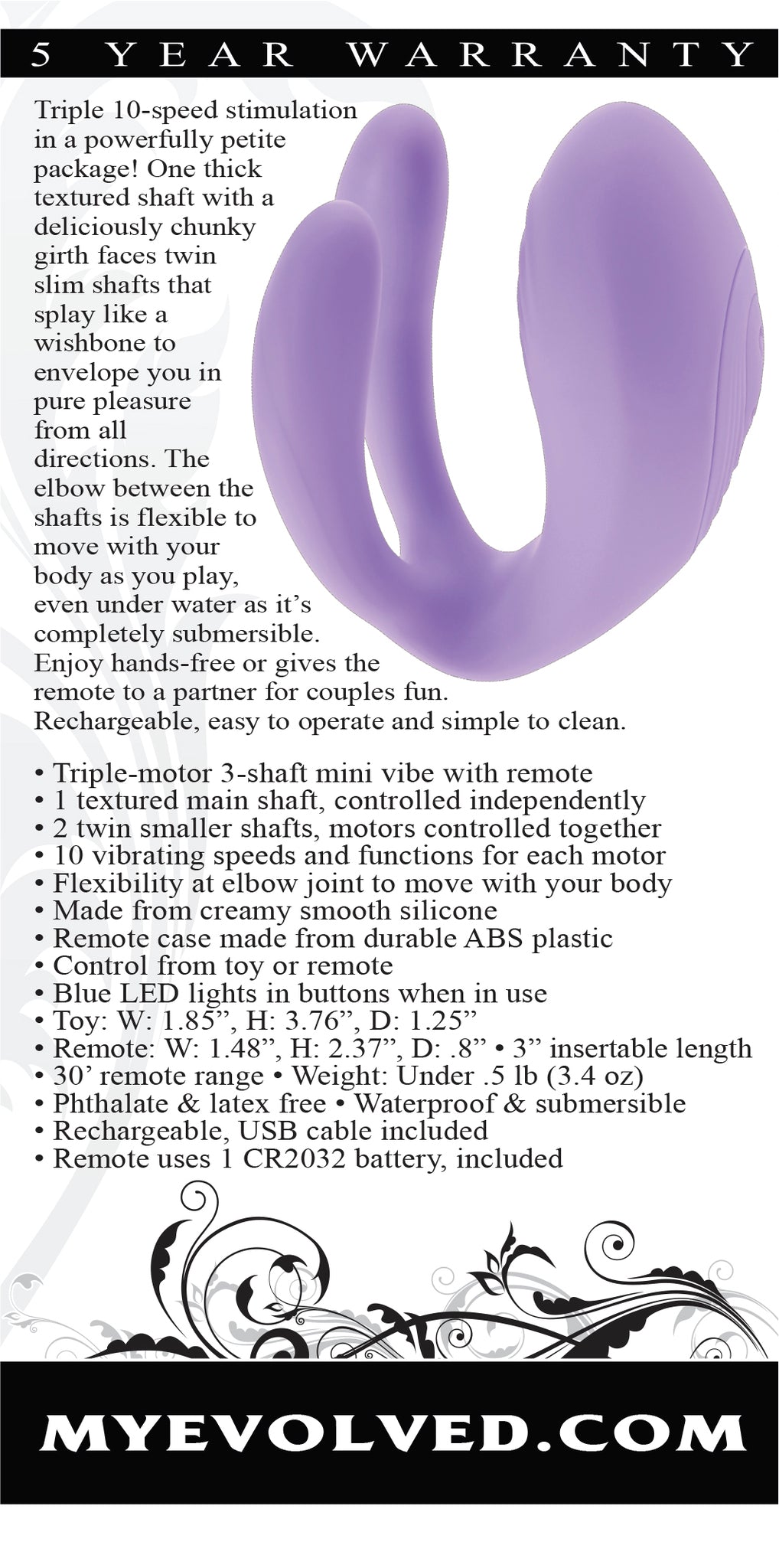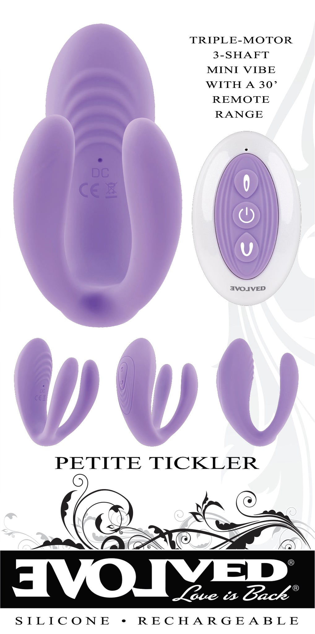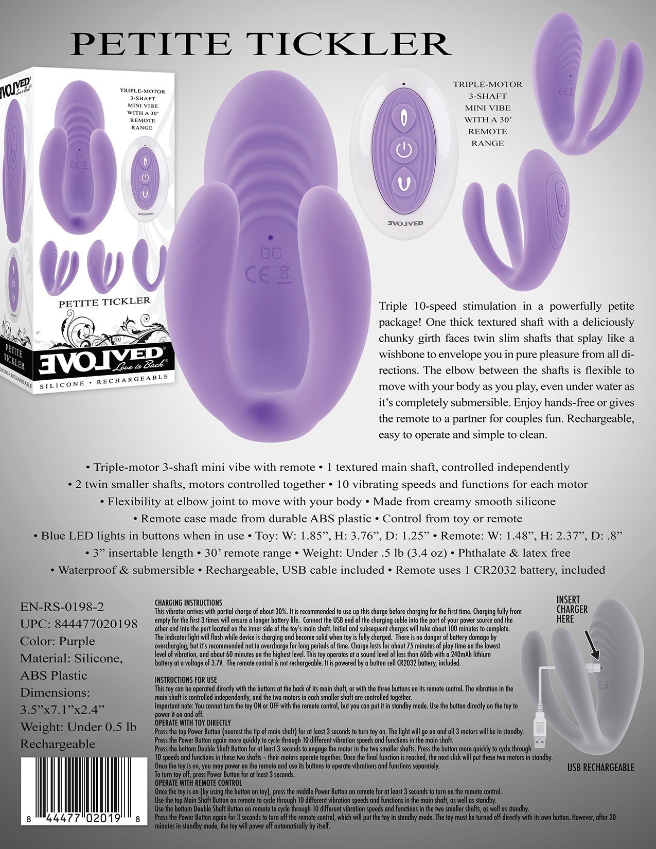 Evolved Petite Tickler Vibrator comes with triple 10 speed stimulation in a powerfully petite package! One thick textured shaft with a deliciously chunky girth faces twin slim shafts that play like a wishbone to envelope you in pure pleasure from all directions. The elbow between the shafts is flexible to move with your body as you play, even under water as it is completely submersible. Enjoy hands free or gives the remote to a partner for couples fun. Rechargeable, easy to operate and simple to clean.