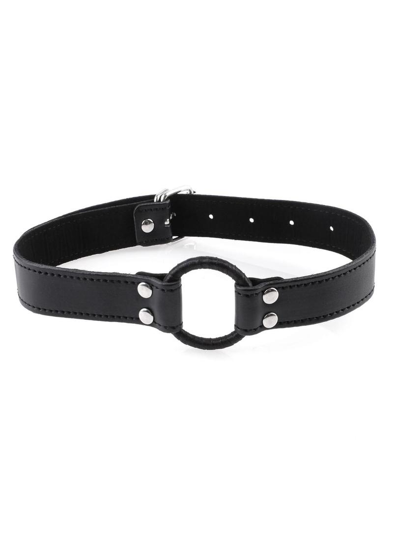 The metal ring gag is wrapped in vinyl and secured in place with an adjustable vinyl head strap and metal buckle. Pull the straps tight and your subjects mouth will magically stay open for you to do as you please!