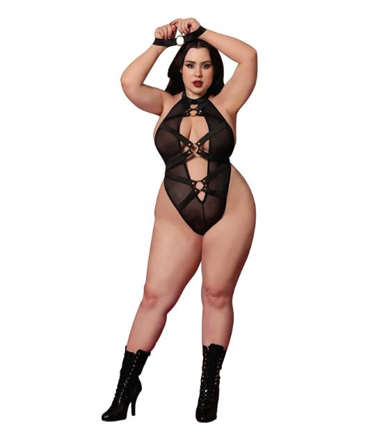 Stretch mesh with elastic teddy and wrist restraints set, Halter neck with hook & Loop closure, plunging neckline, elastic X-straps with gold ring and stud accents, and adjustable back elastic straps, High-leg and open with G-string, Elastic and ring wrist restraints included.