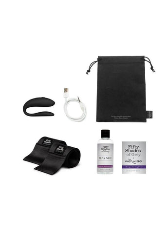 Tie me up, rub me down, let us both feel it all... This kit brings the perfect match of Fifty Shades of Grey and We-Vibe together, so you and your perfect match can share ultra-thrilling vibrations and bondage pleasure sessions.