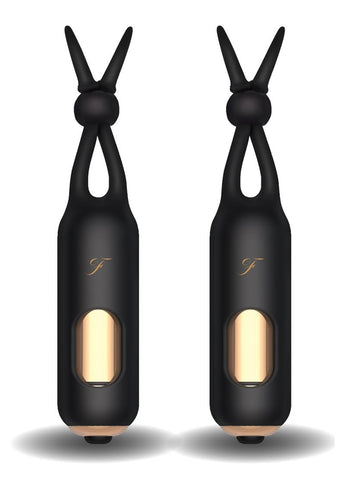 Enhance the sensual sensation of nipple play with a pair of bullet-powered vibrating nipple clamps. Made of silky-soft silicone, these adjustable clamps are easy to use and will turn any erotic play into full-body pleasure. Its beautiful gold accents add a little luster as an added treat for the eyes.