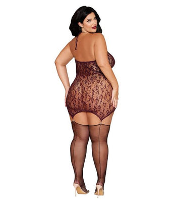 Leopard pattern knitted seamless fishnet chemise with matching rhinestones all-over Halter neckline with metal horseshoe trim and adjustable ties, Garter shaped hem with attached garters. Thong not included.