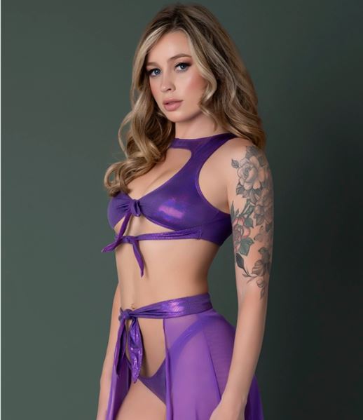Light up the stage, club, or rave scene with the Glimmer High Neck Crop Top, Flowy Skirt & Tanga Set from Exposed Lingerie by Magic Silk’s Glimmer-Dancewear collection. This three-piece wholesale dancewear set features a high neck crop top with front ties and a swan hook back closure, a high-leg tanga, and a sheer mesh flowy skirt that ties in the front. Made from soft, stretchy holographic fabric in a vibrant purple with pink hues, this dazzling ensemble is perfect for performers and nightlife enthusiasts.