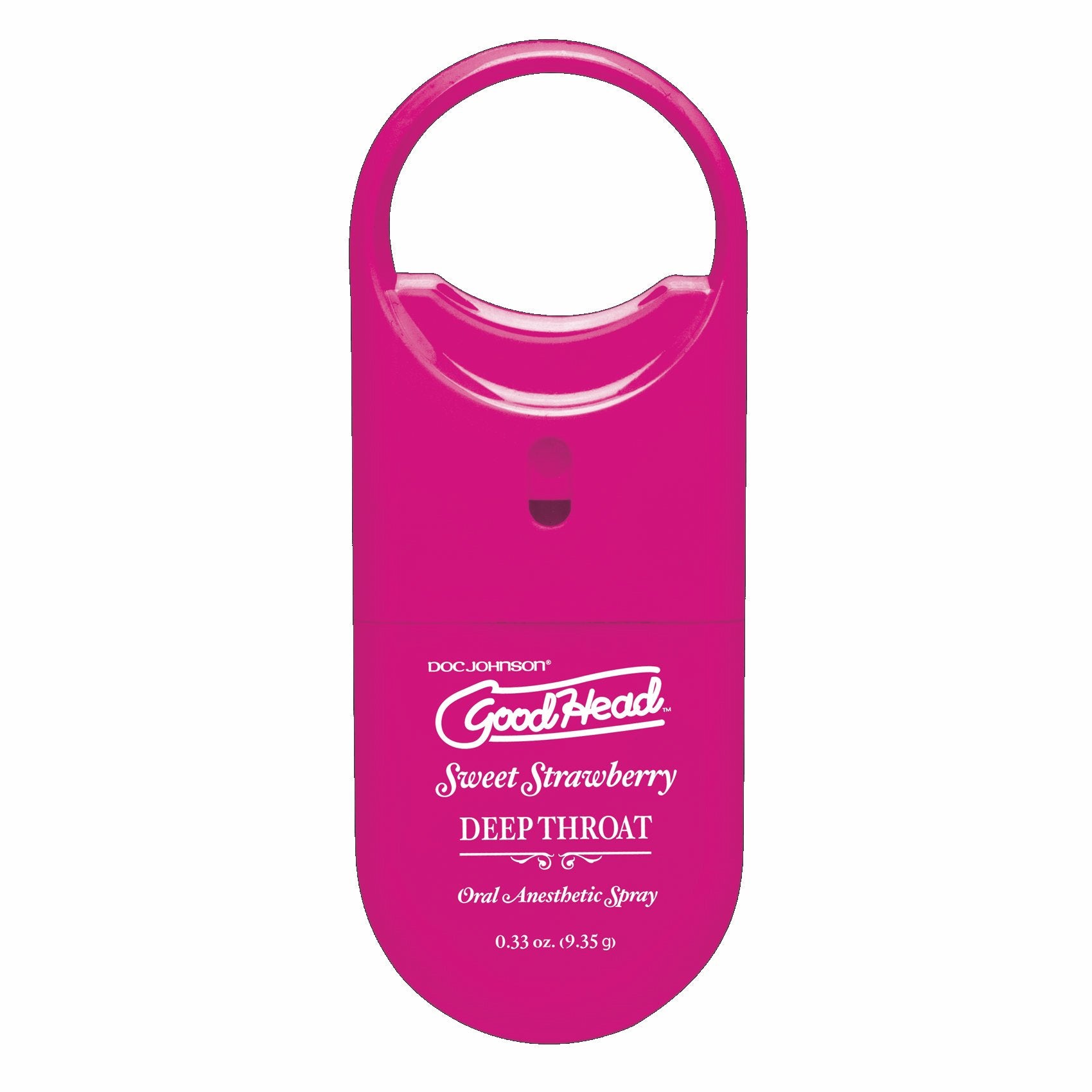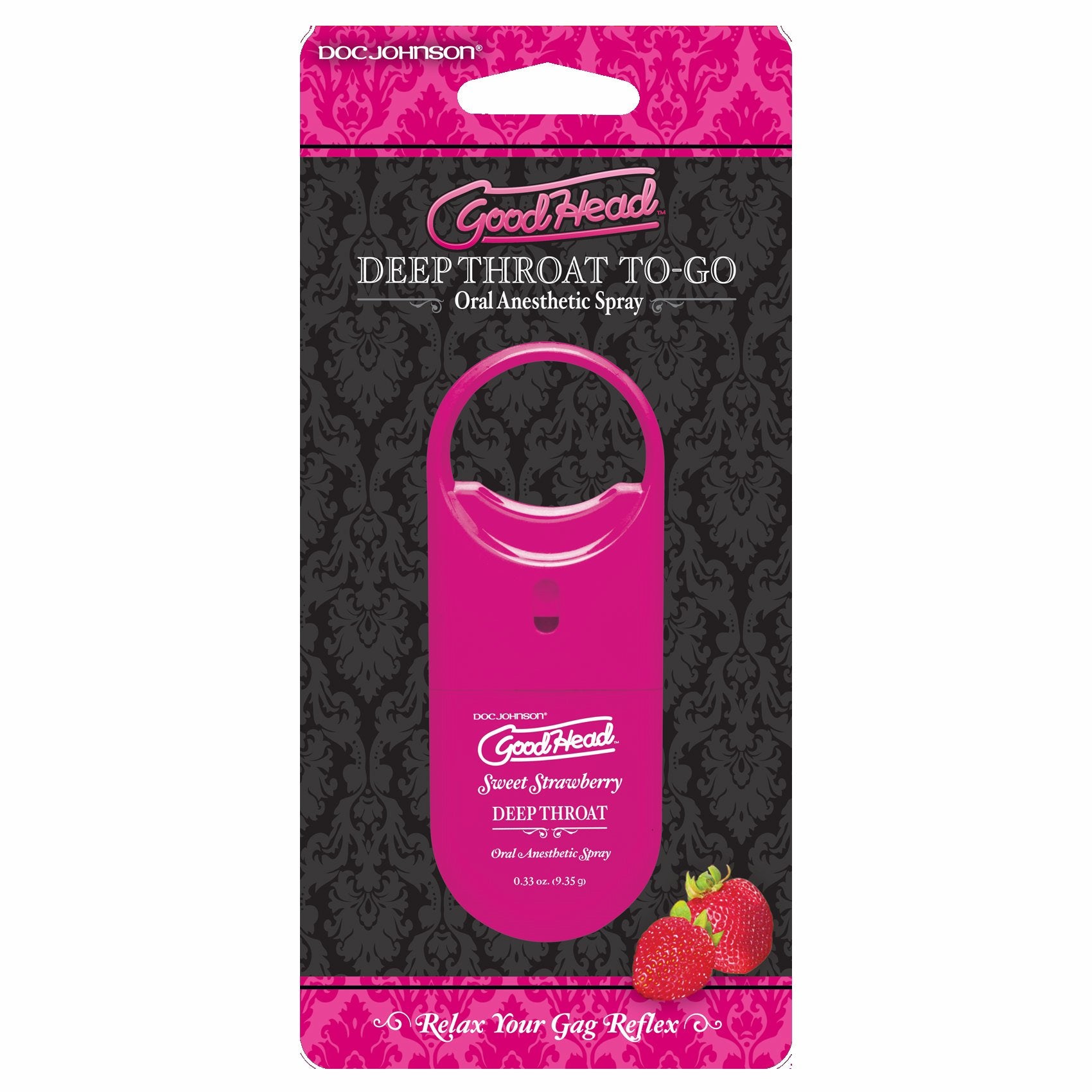 GoodHead To Go Deep Throat Spray Sweet Strawberry .33 fluid ounce. Take the job out of blow job! GoodHead Deep Throat Spray To Go offers a delicious mild numbing agent with a simple spray. No gag reflex, no discomfort, just a mind blowing deep throat experience. Available in 3 freshening flavors: Mystical Mint, Wild Cherry, Sweet Strawberry. Each sold separately. Free of Parabens and Sugar. PETA certified. This delectable desensitizing formula turns good head into great head! Proudly, made in America.
