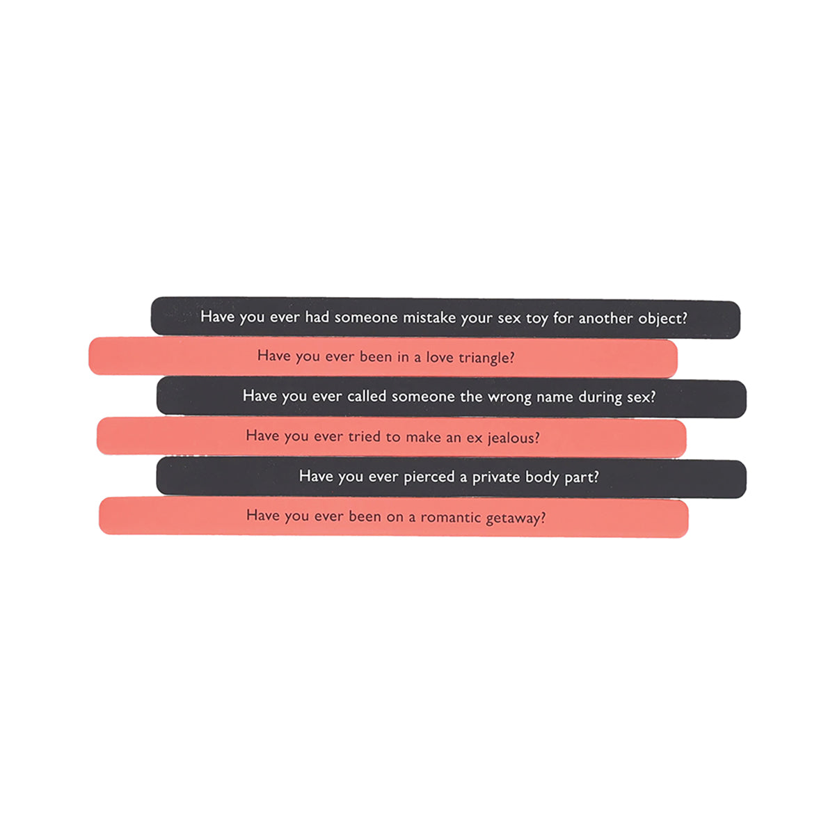 With 100 "have you ever" questions on 50 double-sided sticks, these conversation starters range from benign to risqu. One side of the stick includes sweet, romantic, and funny questions, such as:
