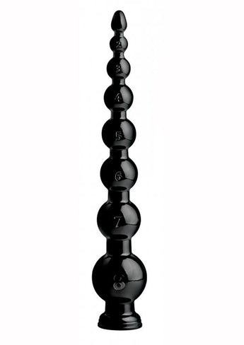 The biggest anal beads you will ever encounter, these eight smooth bulbs present a challenge unlike any other! Interested in anal stretching or gaping? Even a beginner can use this flexible tool, with a small, tapered starting point and gradual increases in size. Bold numbers on each round ball let you know where you are in your progress. Suction down the base to a hard, flat surface for solo use or with a partner. The sleek, phthalate-free material is compatible with water-based and silicone lubricants and cleans off after use with mild soap and warm water .