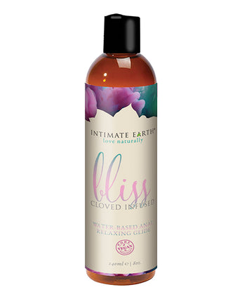 Intimate Earth Bliss Glide Clove infused 8 fluid ounces. Bliss Water Based Anal Relaxing Glide is the only water based anal relaxing glide on the market! Infused with all natural clove. Super thick non drip formula relaxes but does not numb. Can be used with silicone toys! Pure vegan ingredients. Specially formulated with ingredients to play and love. Ingredients: Water, Glycerin, Propanediol, Plant Cellulose, Polysorbate 20, Eugenia Caryophyllus Clove Bud Oil, Psidium Guajava Fruit Extract, Lycium Barbarum Fruit Extract, Cymbopogon Schoenanthus Extract, Aloe Barbadensis Leaf Extract, Sodium Benzoate, Potassium Sorbate, Citric Acid, Flavor.
