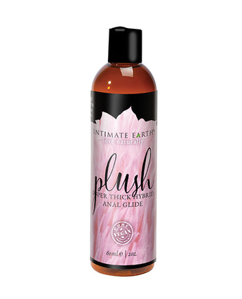 Intimate Earth Plush Super Thick Hybrid Anal Glide 2 fluid ounces. Plush Super Thick Hybrid Anal Glide is the perfect blend of water and Silicone. The Intimate Earth Plush Super Thick Hybrid Anal Glide Silicone, Water Based Lubricant in 2 ounces is infused with organic Licorice Root, this hand crafted hybrid silk creates a luxurious and creamy feeling. Enjoy comfort and cushion of the Plush Super Thick Hybrid Anal Glide Silicone-Water Based Lubricant during anal sex. Extremely long lasting, smooth, and safe to use with platinum cured silicone toys. The new Super Thick Hybrid Glide Standard for Anal! Packed in a bottle with a flip top cap for easy dispensing, it is available in a 2 ounces travel size, 4 ounces and an economical 8 ounces size bottle. Intimate Earth ultimately wants people to feel good about the origin of the products they choose for intimacy. This Intimate Earth product is latex condom friendly and can be used with all types of adult toys. For easy cleanup after intercourse or sexual play use the Intimate Earth Green Tea Tree Oil Foaming Toy Cleaner. Intimate Earth is made in the USA! Size: 2 ounces. Ingredients: Water, Propanediol, Isopropyl Palmitate, Dimethicone, Corthellus Shiitake Mushroom Extract, Glycyrrhiza Glabra Licorice Root Extract, Polysorbate 60, Glyceryl Stearate, Aloe Barbadensis Leaf Extract Organic, Cymbopogon Schoenanthus Extract Organic, Lycium Barbarum Goji Fruit Extract Organic, Sorbitan Stearate, Plant Derived Glycerin, Xanthan Gum, Glycerin, Ethyl Lauroyl Arginate HCl, Citric Acid. Intimate organics lubes and intimate care. Intimate Earth has crafted a new innovative collection of award winning modern organic apothecary products. this new elegant line includes a wide range of healthy products that our customers have come to expect. Their unique formulations contain a proprietary blend of organic extracts and soothing aloe. Lastly, Intimate Earth is proud to offer products that are 100% vegan and never tested on animals. This line used to called Intimate Organics but has re-branded to Intimate Earth. Pure vegan. Categories: Anal Toys, Lubricants, Anal Lubes, Lotions, Sprays, Creams, Hybrid Personal Lubricant.