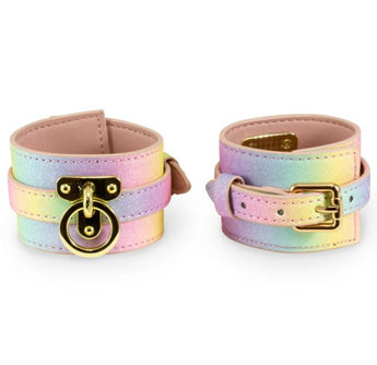 Add a little color to your BDSM repertoire with an adjustable pair of rainbow wrist cuffs. The buckles keep your wrists bound and removable gold-accented hardware make it easy to use them however you like. Durable, beautiful and fun, these cuffs will complete your ultimate BDSM fantasy.
