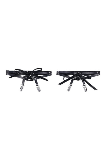 Add a touch of flirtatious elegance with these captivating garters, featuring a sultry lace-up corset design. Black satin ribbon weaves through the faux leather panels, creating an adjustable fit that hugs your thighs with seductive precision. A secure clip keeps thigh-high stockings perfectly in place, while the combination of bold structure and soft satin details strikes the perfect balance between edgy and romantic. Whether you're embracing your daring side or indulging in a moment of sensual confidence, these garters are designed to make a statement Fits thighs 18" (45.7 cm) to 26" (40.6 cm) Corset design add sex appeal and extra adjustability Built-in clip ensures stockings stay in place Materials: 50% Polyester, 30% PU, 20% Iron Alloy
