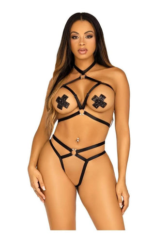 Leg Avenue Satin Elastic Body Harness Teddy with Silver Bypass Rings and Adjustable Straps - Black/Silver - One Size