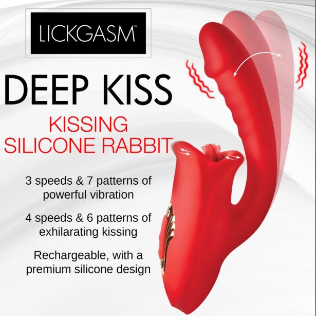 Let this Deep Kiss rabbit vibe wrap its lips around your hooded gem, lick it and buzz it to new heights of ecstasy, all while being penetrated by a flexible, ribbed, vibrating rod! This rabbit toy is a little different. You get to enjoy the adjustable shaft that has a large, round end and ribbed shaft. Position it so that it hits the right spot and gets the perfect angle for your body shape. Choose between 3 speeds and 7 patterns of powerful vibration! As you glide it inside with the help of some lube, align the kissing lips of that luscious mouth to your precious pearl and enjoy another 4 speeds and 7 patterns of lip movement and tongue vibration! Made out of silky smooth, phthalate-free, body-safe silicone, this premium quality toy is best used with water-based lubricants only. Take it in the shower, too! It's rated IPX6 waterproof so it can handle those powerful jets as you let go in a steamy setting! Do not submerge underwater, though. To recharge, use the USB cable provided.