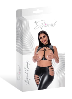 Liquid Onyx Open Vest and Leggings Black S/M from Magic Silk Lingerie. From the Exposed by Magic Silk collection, this style includes: an open cup vest with a string tie fastening at the neck, cross strap design with a silver tone O-ring in the middle and a zip up design with a silver-tone O-ring at the bottom and leggings with open cut out designs. Sleek wet look in jet black and provocative designs are the perfect match for a night of bedroom play. Fabric content: 90% Nylon, 10% Spandex. Size small to medium fits ladies dress sizes 4 to 10. Categories: Clothing, Sexy Clubwear, Bedroom Costumes, Lingerie, Clothing, Naughty Role Play, Stockings, Panyhose, Garters. 2023.