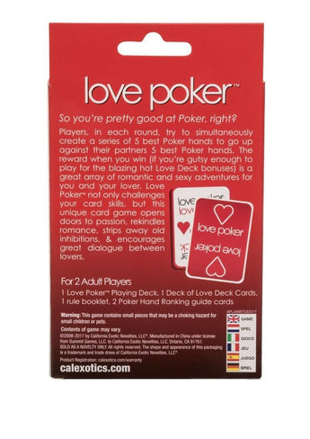 So you're pretty good at poker, right? Card game for couples opens doors to passion, rekindles romance, strips away inhibitions, and encourages great dialogue between lovers. For 2 adult players. Includes: 54 Love Poker cards, 52 Love cards, 2 poker hand ranking guide cards, 1 rule booklet with instructions.